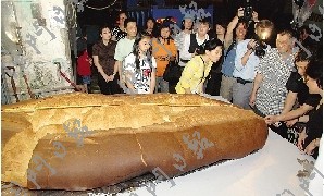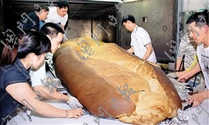澳門豬扒包遠近馳名,這次壯舉,由澳門女企業家與金馬輪咖啡餅店合作,并由金馬輪店焗制。巨型豬扒包長293公分、寬155公分、高33公分,共重540磅,動用面粉200斤、豬扒80磅。從搓面粉、發酵等工序到最終“面世”,共耗時逾13小時,需7個員工合力制作。
