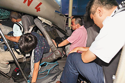 由于沖擊力度猛烈,意外后小巴車(chē)頭陷入堅(jiān)硬貨柜尾,司機(jī)首當(dāng)其沖奄奄一息;車(chē)廂內(nèi)多排座椅椅腳斷開(kāi),座位向前傾倒,部分乘客如“三明治”般人疊人受困,其余乘客則被拋離座位撞傷。同時(shí),車(chē)頭引擎開(kāi)始冒出火舌及濃煙,全車(chē)人危在旦夕。