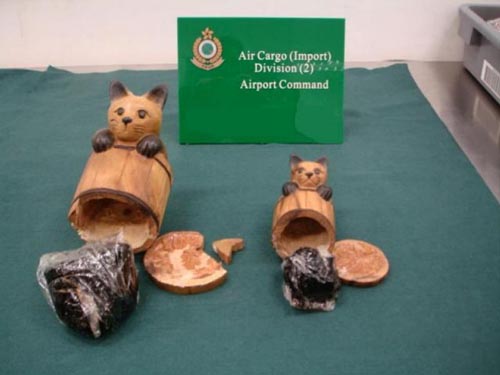 案情透露,海關機場科人員于9月27日清晨檢驗五件由清邁經香港轉運到加州,報稱“木制工藝品”的紙箱包裹。關員利用X光檢查后,發現箱內物品可疑,并開箱割開多件“木制貓”雕刻品檢驗,發現內里藏有用膠袋包裝的熟鴉片,共重約29公斤。