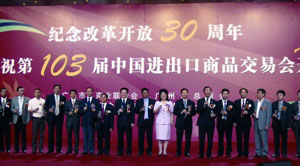 由廣州市工商聯(lián)、市總商會、市外商投資企業(yè)商會、市民營企業(yè)商會共同主辦的“紀念改革開放30周年暨慶祝第103屆中國進出口商品交易會開幕宴會”,14日在廣州白云國際會議中心舉行。廣州市長張廣寧,市委副書記蘇志佳,市委常委、統(tǒng)戰(zhàn)部長孔少瓊等,以及粵港澳商界代表逾1000人出席。