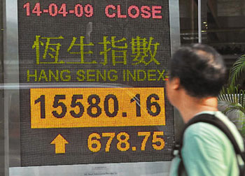 中新網(wǎng)4月15日電 據(jù)香港《文匯報》報道,外圍在復(fù)活節(jié)長假期間,股市持續(xù)向好,令港股14日要追回有關(guān)升幅,恒指高開401點后追貨買盤支撐大市,一眾當(dāng)炒股份向上,全日收報15580點,升678.7點,升幅達(dá)4.5%,是今年1月7日港股跌穿15000點后,4個月以來首次重上15000點收市,且成交續(xù)增至754.21億元。