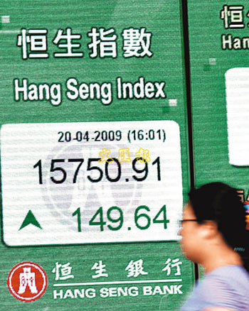 中新網4月21日電 據香港《文匯報》報道,港股20日顯著波動,好淡爭持,仍未能突破16000點大關,成交也有所減少。恒指20日低開后曾跌至15382點低位,其后指數回升,從低位一下子反彈至15878點水平,波幅超過500點。全日恒指先跌后升報15750.91點,升149.6點,成交572億元。