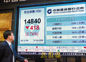 中新網4月28日電 據香港《文匯報》報道,雖然上周五美股上升,但在豬流感疫情擴散的影響下,港股27日低開98點后,加上工行外資股東限售股28日解禁,令內銀股受壓,恒指隨后失守15000點,收報14840點,跌418點或2.74%,國企指數跌337點,報8641點,大市成交530億元。
