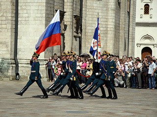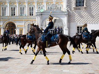 自2005年起,在氣候轉暖的4-10月,每逢周六中午克里姆林宮前就會進行總統衛隊步兵和騎兵的換崗儀式。其中,每月的前三個周六在克里姆林宮廣場進行,剩下的在紅場進行。(梁旭)