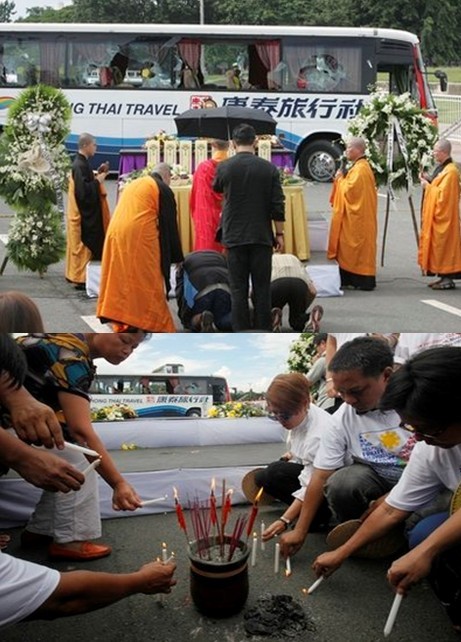 中新網8月25日電 綜合媒體報道,8月25日,是菲律賓所定的全國哀悼日,菲律賓人將與中國人一道,悼念在菲人質劫持事件中遇難的中國香港游客。港府從24日至26日,連續三天為菲律賓人質事件遇難者下半旗志哀。在菲律賓,民眾前往黎剎公園事發現場給遇難者獻花,氣氛凝重;遇難者家屬24日舉行路祭,場面催人淚下。
