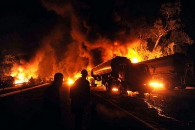中新網(wǎng)10月7日電 綜合報(bào)道,塔利班分子6日在巴基斯坦西部奎達(dá)附近出擊,攻擊北約部隊(duì)的一支運(yùn)輸車隊(duì),燒毀20多輛運(yùn)油車,有一個(gè)司機(jī)不幸身亡。之后,在西北部城市瑙謝拉,又有至少36輛油罐車遭武裝分子襲擊起火。連昨天的兩次攻擊在內(nèi),過(guò)去的一星期內(nèi),這類事件已經(jīng)發(fā)生5次。