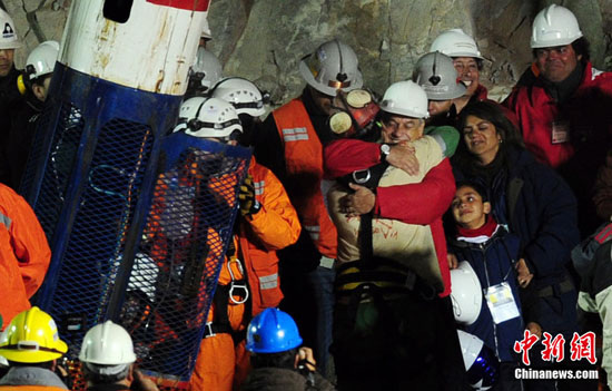 他脫險后立刻與7歲兒子緊緊相擁,接著抱住妻子,然后是智利總統皮涅拉及其它工作人員。