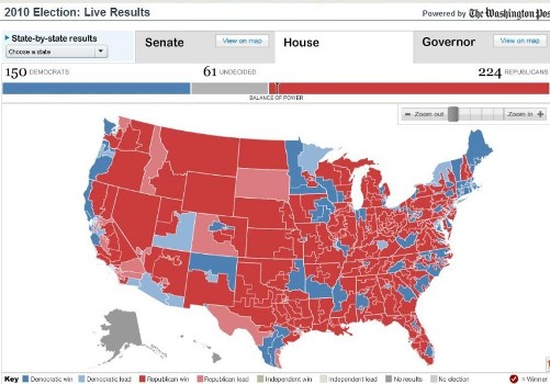 總統奧巴馬所在的民主黨在眾議院已開出的席位中獲得了150個席位;而其最大對手——共和黨在已開出的席位中,已占據224個席位。還有61個議席等待開出。
