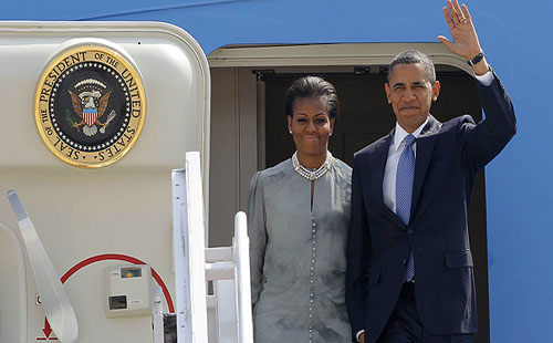 報道稱,奧巴馬乘坐的“空軍一號”專機于當地時間中午12時50分左右降落孟買國際機場。美國總統和第一夫人走出機艙向迎接的美印兩國政要招手致意。