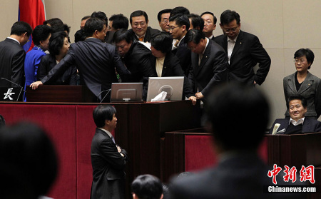 中新網12月8日電 據韓國媒體消息,韓國首爾國民議會大廳7日再次上演“全武行”,朝野議員爆發嚴重肢體沖突。