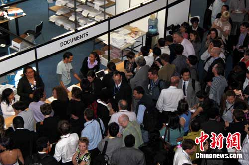 中新社記者現場目擊,在文件發放處排起了很長的隊伍,廣大與會者特別是談判代表都希望先睹為快。文件發放處前人潮洶涌,多名聯合國警察被調往現場維持秩序。