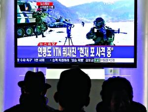 韓國各界對軍方舉行射擊訓練的消息十分關注。街頭公共電視屏幕前擠滿了觀眾。