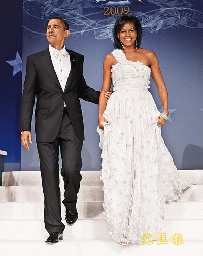 米歇爾晚間出席華盛頓會議中心的舞會,換上一襲白色雪紡曳地長裙,右肩披一條帶子,感覺飄逸,裙身飾滿小絨毛球,及肩吊墜耳環閃閃生輝。她領跳第一舞前,奧巴馬還向嘉賓打趣說:“第一件事,我太太漂亮嗎?”惹來全場歡呼喝彩。
