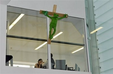中新網8月29日電 綜合報道,意大利北部博爾扎諾省一所藝術博物館28日稱將繼續展出一只綠色青蛙被釘在十字架上的雕塑,隨之引起了羅馬教皇本篤十六世和當地官員的不滿。