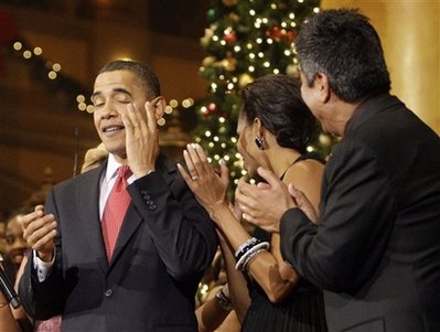 奧巴馬在白宮的第一個圣誕晚會,邀請了多名歌手到場表演,不過,可能是因為現場氣氛太溫馨感人,奧巴馬竟在合唱圣歌時偷偷擦掉流下來的眼淚。