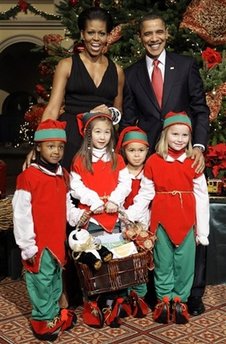 奧巴馬夫婦13日在圣誕晚會上開心地和小精靈們一一握手合照,美國總統夫人米歇爾還會在拍照時,要大家“看著所有的閃光燈,給攝影師一個笑容”,并且指導小朋友如何擺出一個完美的笑容。