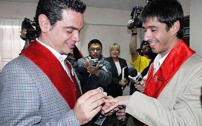 本月初,在首都布宜諾斯艾利斯結婚的計劃遭到拒絕后,同性戀權利活動家阿歷克斯•弗里爾(Alex Freyre)和何塞瑪麗亞•狄貝洛(Jose Maria Di Bello)于28日在火地島首府烏斯懷亞,在朋友和官員的見證下舉行了婚禮。