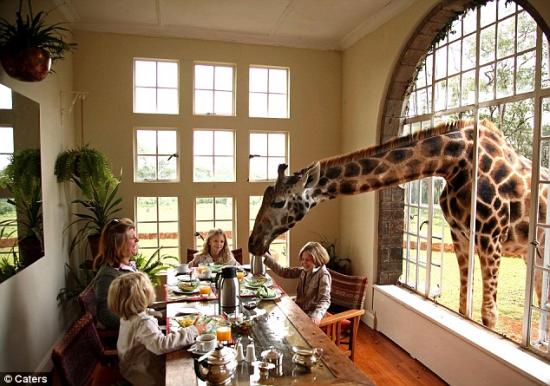 每天快到九點時,這些長頸鹿就把腦袋伸進窗戶里,等待主人準備他們的早餐。這種羅斯切爾德長頸鹿是長頸鹿中的第二大瀕危種群。妻子坦雅說:“這個莊園以前的主人在長頸鹿的繁育方面做得很成功,我們也將繼續下去!