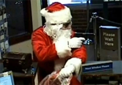 中新網12月24日電 據英國媒體報道,美國一名男子打扮成慈祥的圣誕老人模樣背著一個大麻袋走入銀行,正在辦理業務的顧客一陣欣喜,以為他要為大家發禮物,沒想到這個“圣誕老人”竟然掏出一把槍,大喊一聲:搶劫了!