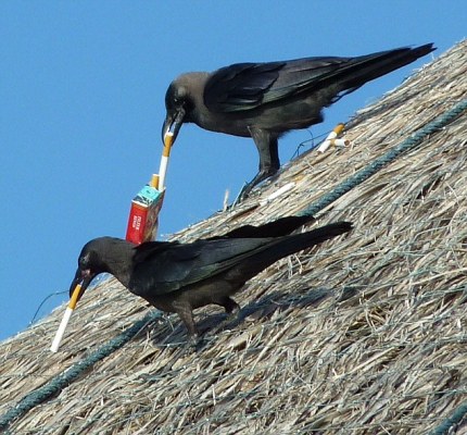 令人詫異的是,這只烏鴉頗為熟練的從煙盒中叼出一根香煙,站在屋頂?shù)囊唤羌毤殹捌肺丁保瑺顟B(tài)十分滑稽。而它的一只同伴見狀也做出了幾乎同樣的行動。