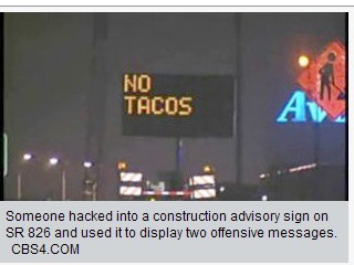 公路旁的電子廣告牌,應(yīng)該是提供交通信息,但邁阿密這條公路旁的廣告牌,卻出現(xiàn)了“不要拉美人士”、“不要玉米餅”的字樣,原來是這個(gè)廣告牌遭到黑客入侵,惡意竄改了顯示的的字樣。