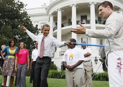 中新網(wǎng)9月17日電 綜合媒體報(bào)道,奧巴馬16日在白宮南草坪“耍劍”,他還與曾在北京奧運(yùn)會(huì)擊劍項(xiàng)目中獲得銀牌的莫豪斯較量起來(lái)。
