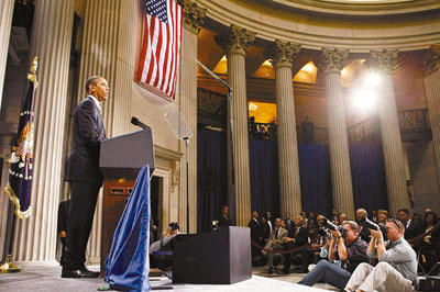 演說于當地時間14日正午12時10分舉行,地點是紐約聯邦國家紀念堂,鄰近紐約證券交易所。奧巴馬重申上任以來穩定經濟措施的成效,并強調華府已成功避免第2次大蕭條重臨。