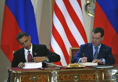 當(dāng)?shù)貢r間8日中午,俄羅斯總統(tǒng)梅德韋杰夫與美國總統(tǒng)奧巴馬在捷克總統(tǒng)府西班牙大廳舉行了隆重的簽約儀式。雙方簽署了俄美削減進(jìn)攻性戰(zhàn)略武器的新條約。