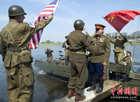 1945年4月25日,一支美軍偵察隊與一隊蘇軍在德國城市托爾高(Torgau)南部易北河畔的一座橋上勝利會師,一幅美蘇兩軍士兵握手的照片從此傳遍世界,成為反法西斯戰爭歐洲戰場出現勝利曙光,希特勒政權即將滅亡的最廣為人知的象征之一。