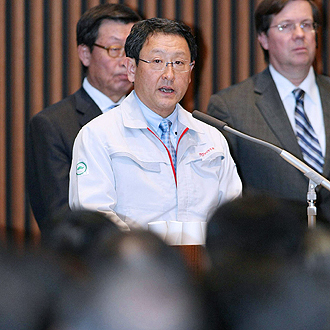 身著一身灰色夾克式工作服的豐田章男在公司總部向2000多名在場的員工鼓勁稱:“讓我們抖擻精神,以謙卑的態(tài)度和十足的信心迎接未來的挑戰(zhàn)”。他說,從今天起,豐田公司將“從頭再來”。
