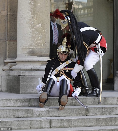 中新網6月25日電 據英國媒體報道,法國愛麗舍宮的衛兵負責保護最重要的國家領導人和外國權貴,但“堅強勇敢”的衛兵竟然抵擋不住第一夫人布魯尼的回眸一笑而坐倒在地。