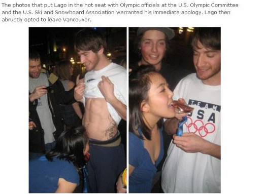 日前,一些關于拉戈在比賽后慶祝勝利盡情放松的照片在互聯(lián)網上流傳。從照片上看,拉戈與朋友們的慶祝方式極為不雅,他因此被斥為美國隊的恥辱。照片中,拉戈在溫哥華市內的一處房屋內,身著美國隊訓練服,佩戴著剛剛獲得的銅牌,而一名不知名的女子在他的腰部左右的位置親吻拉戈的獎牌。