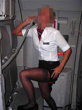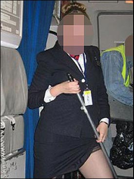 照片中的這些英航空姐穿著獨特的紅、白、藍色的制服,撩起裙子后丁字褲顯而易見,露出臀部和性感絲襪。