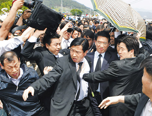 23日,和隨行人員一起乘坐大巴來到峰下村的韓國國務總理韓升洙在村子的入口處被“熱愛盧武鉉的人們的集會(盧愛會)”會員和村民攔住。