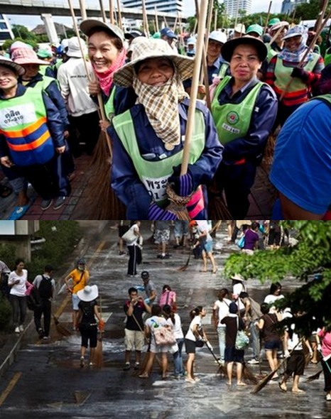在網(wǎng)上發(fā)起年輕人前來清洗的一名前航空公司官員說,“在危機(jī)面前,我沒法坐視不管。我上網(wǎng)發(fā)信息,邀約大家來清掃街道”。“我決定每周末都出去清理曼谷市容,直到曼谷恢復(fù)原樣”。