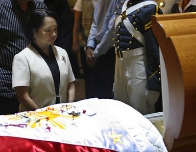 遺體其后由靈車送到先夫阿基諾墓旁落葬,儀仗隊鳴放21槍向阿基諾夫人致敬。整個運送靈柩過程歷時8小時,送別阿基諾夫人民眾連綿18公里。