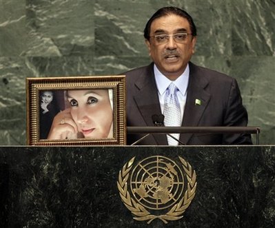 中新網9月27日電 巴基斯坦總統扎爾達里在聯合國大會上演講時,把他的已故夫人貝-布托和岳父布托的照片擺上演講臺,并吁請世界各國為巴國打擊恐怖主義和宗教極端主義提供更多協助。