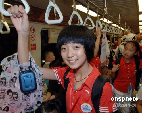 福建小營員乘坐臺北捷運、快樂體驗臺北捷運。中新社發 劉可耕 攝