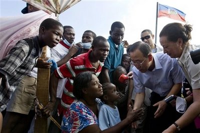 聯合國秘書長潘基文一行17日在海地了解地震造成的損失并掌握了第一手的災情資料。面對嚴峻的救援情況,日漸絕望的海地災民,在被問到是否有足夠的救援物資滿足數以百萬計的災民時,潘基文說:“我真心希望并呼吁海地人民要更加耐心”,他還表示不希望看到發生騷亂。