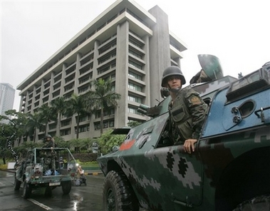 菲律賓首都馬尼拉氣氛十分緊張。菲律賓軍隊已經(jīng)攻入該酒店,目前還不清楚是否有人員傷亡。菲律賓前總統(tǒng)埃斯特拉達等人已經(jīng)發(fā)表聲明,否認與此事有關(guān)。