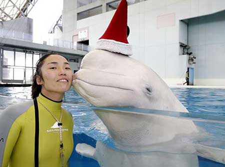 中新網12月19日 綜合媒體報道,由于圣誕節將至,日本橫濱八景島海洋樂園為了吸引更多的游客前來游覽亮出奇招,給館內的兩頭白鯨戴上可愛的圣誕帽,前來游覽的游客甚至有機會得到這兩頭戴著圣誕帽的白鯨的親吻。