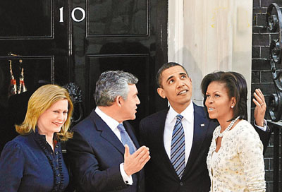 米歇爾陪同丈夫到唐寧街做的第一件事,便是與英國首相伉儷共進早餐。