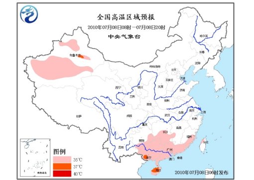 中新網7月8日電 中央氣象臺8日6時繼續發布高溫黃色預警,預計,今天白天,貴州南部的部分地區、湖南中南部、江西中部偏西地區、福建東部、廣東、廣西、海南、臺灣西北部等地有35~38℃的高溫天氣。