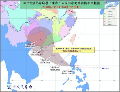 中新網7月14日電 據中央氣象臺最新消息,“康森”昨天夜間23時前后在呂宋島東南部沿海登陸,登陸時中心附近最大風力有11級(30米/秒),目前減弱為強熱帶風暴,今天凌晨5時“康森”中心位于呂宋島南部地區(北緯14.8度,東經120.7度)。