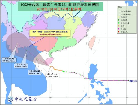 預(yù)計(jì),“康森”將以每小時(shí)15-20公里的速度向西偏北方向移動,將于16日夜間在海南三亞到樂東一帶沿海登陸;也有可能從海南南部近海擦過。