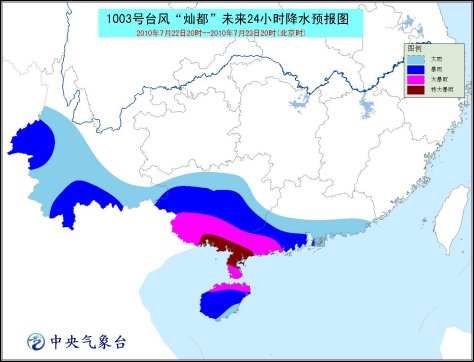 受其影響,22日晚上到23日白天,南海西北部、海南沿海、瓊州海峽、北部灣、廣東西部沿海、廣西沿海將有7-9級大風,部分海域或地區風力可達10-11級,陣風12級;廣東沿海和西南部、廣西大部、海南、云南西部和南部等地有大雨或暴雨,其中,廣東西南部、廣西南部、海南北部的部分地區有大暴雨或特大暴雨。