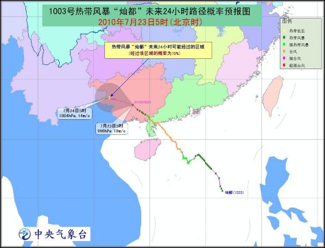 臺風“燦都”于22日19時在廣東省西部廉江境內減弱為強熱帶風暴,20時其中心進入廣西博白境內,隨后減弱為熱帶風暴。23日5時熱帶風暴“燦都”的中心位于廣西南寧市境內,就是北緯22.9度,東經108.5度,最大風力有8級(18米/秒),中心最低氣壓為996百帕。