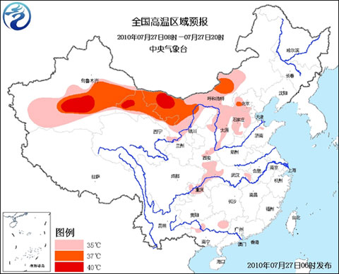 中央氣象臺7月27日06時繼續發布高溫藍色預警: