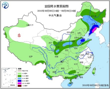 8日08時(shí)至9日08時(shí),新疆天山地區(qū)和南疆西部、西藏大部、青海東北部和南部、西北地區(qū)中東部、內(nèi)蒙古中東部、東北、華北、黃淮大部、江淮西部、江漢、江南中西部、華南大部、西南以及臺(tái)灣等地有小到中雨或陣雨,其中,黑龍江南部、吉林大部、遼寧大部、河北中南部和東部、北京東部、天津、山東北部以及內(nèi)蒙古東部的部分地區(qū)、海南大部、臺(tái)灣南部等地有大雨或暴雨,吉林東南部、遼寧中東部等地的局地還將有大暴雨;上述部分地區(qū)并伴有短時(shí)雷雨大風(fēng)等強(qiáng)對(duì)流天氣。內(nèi)蒙古中東部、東北西部等地有4~6級(jí)風(fēng)。黃海、東海、臺(tái)灣海峽將有5~8級(jí)風(fēng)。