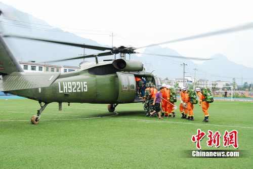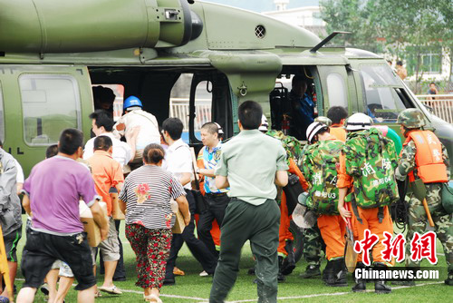中午12時05分,空軍陸航團派出兩架直升飛機前來支援,深入災區探測道路情況和人員被困情況。從下午1點14時45分至下午4點,消防支隊共派出30人,由參謀長徐昌榮帶隊分六批次搭乘空軍陸航團飛機帶上破拆工具、生命探測儀、照明工具、水上救援工具、安全救生繩索等已安全到達清平災區。30名消防官兵到達災區后,立即設立了消防部隊搶險救援指揮部,指揮一線官兵積極投入救援工作,爭分奪秒營救被困群眾。